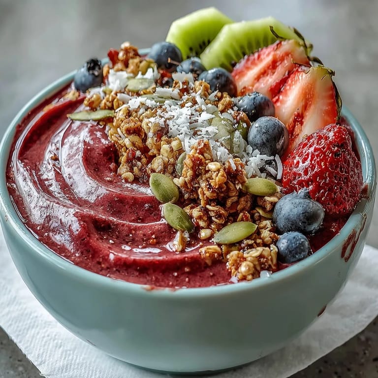 Get creative with your toppings! While granola and kiwi are classic choices, you can try mango, peaches, or pomegranate seeds for a seasonal twist. For a refreshing, non-alcoholic drink pairing, serve this bowl alongside a chilled glass of kombucha to complement the earthy and fruity flavors of the beet and berries.