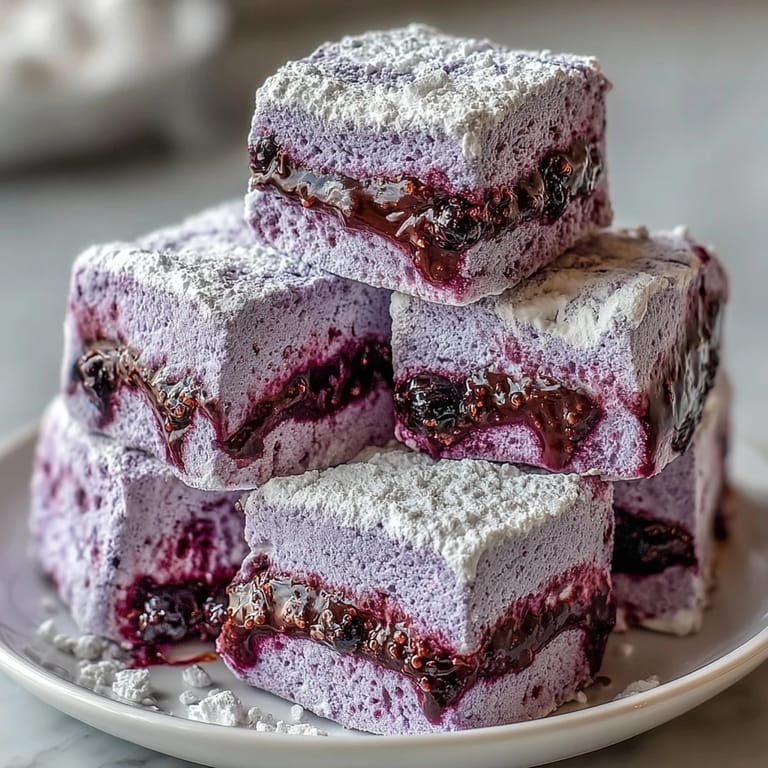 Pin this There's something magical about watching marshmallows transform from a cloudy mixture into pillowy clouds of sweetness, and the first time I added blackcurrant purée to the whip, I couldn't believe how the color shifted into this soft lavender hue. My kitchen filled with the tart, jammy aroma, and I knew immediately that these weren't going to be ordinary marshmallows. What started as curiosity about making homemade confections turned into an obsession with capturing that bright, sophisticated flavor in something so comfortingly fluffy.