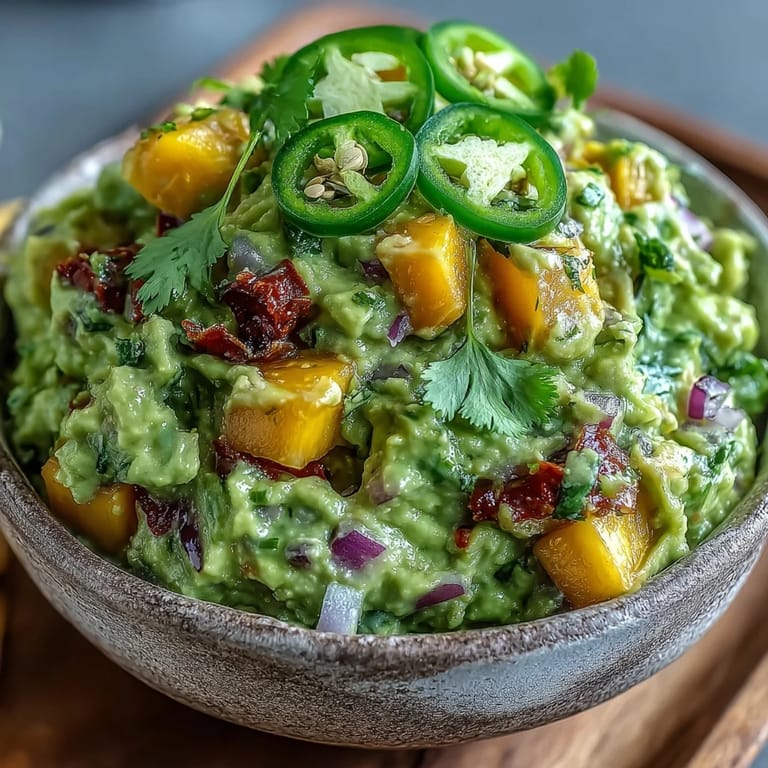 The magic here is that mango and jalapeño combination that most people don't think to put together. The fruit's natural sweetness softens the heat so it doesn't attack your mouth, instead creating this pleasant warming sensation that keeps you reaching back for more. It's also why this guac works so well at celebrations—people who usually skip spicy things find themselves enjoying it, and people who love heat are surprised by how refined it feels.