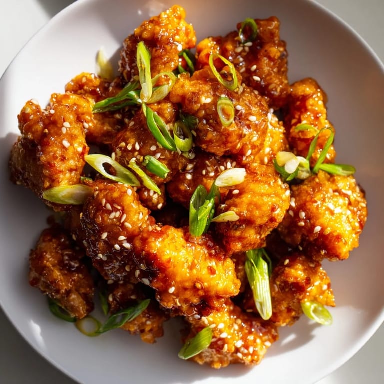- Add the fried chicken to the sauce, tossing gently to coat every piece evenly, and cook for 2 minutes to heat through. Transfer to a serving platter, scatter spring onions and sesame seeds on top, and serve immediately while it's hot and crispy.