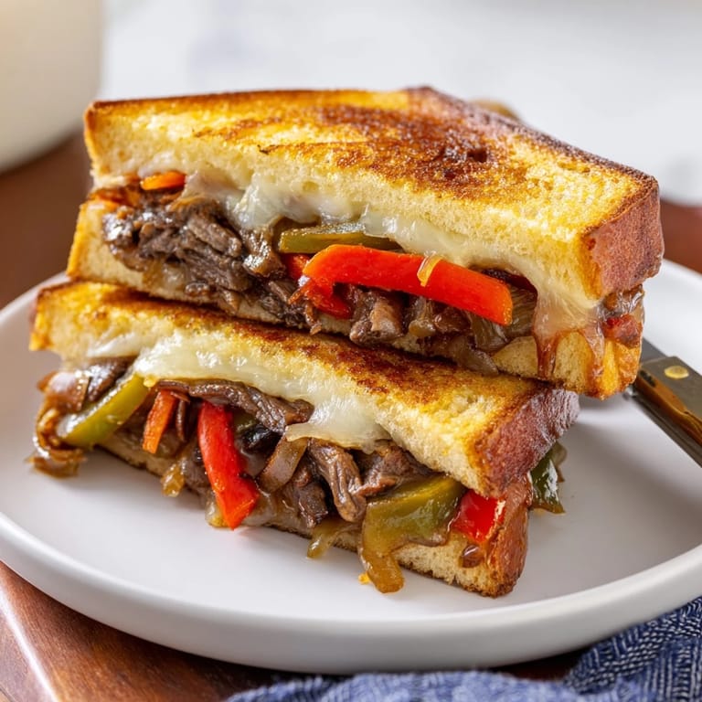Pin this My teenage son came home one afternoon demanding "real food" after practice, and I had leftover steak in the fridge that wasn't quite enough for dinner. I started piling it into a grilled cheese with whatever vegetables I had, and halfway through cooking, the smell hit me—that unmistakable Philly cheesesteak aroma mixed with buttery toasted bread. He took one bite and declared it better than any sandwich shop version. I've been making these ever since, and they disappear faster than I can flip them.