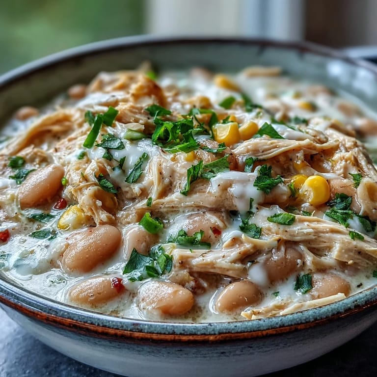Pin this Warm up with a bowl of this comforting and hearty White Chicken Chili. This flavorful dish combines tender shredded chicken, creamy white beans, and sweet corn in a luscious broth with a subtle touch of spice, making it a perfect meal for a cozy evening.